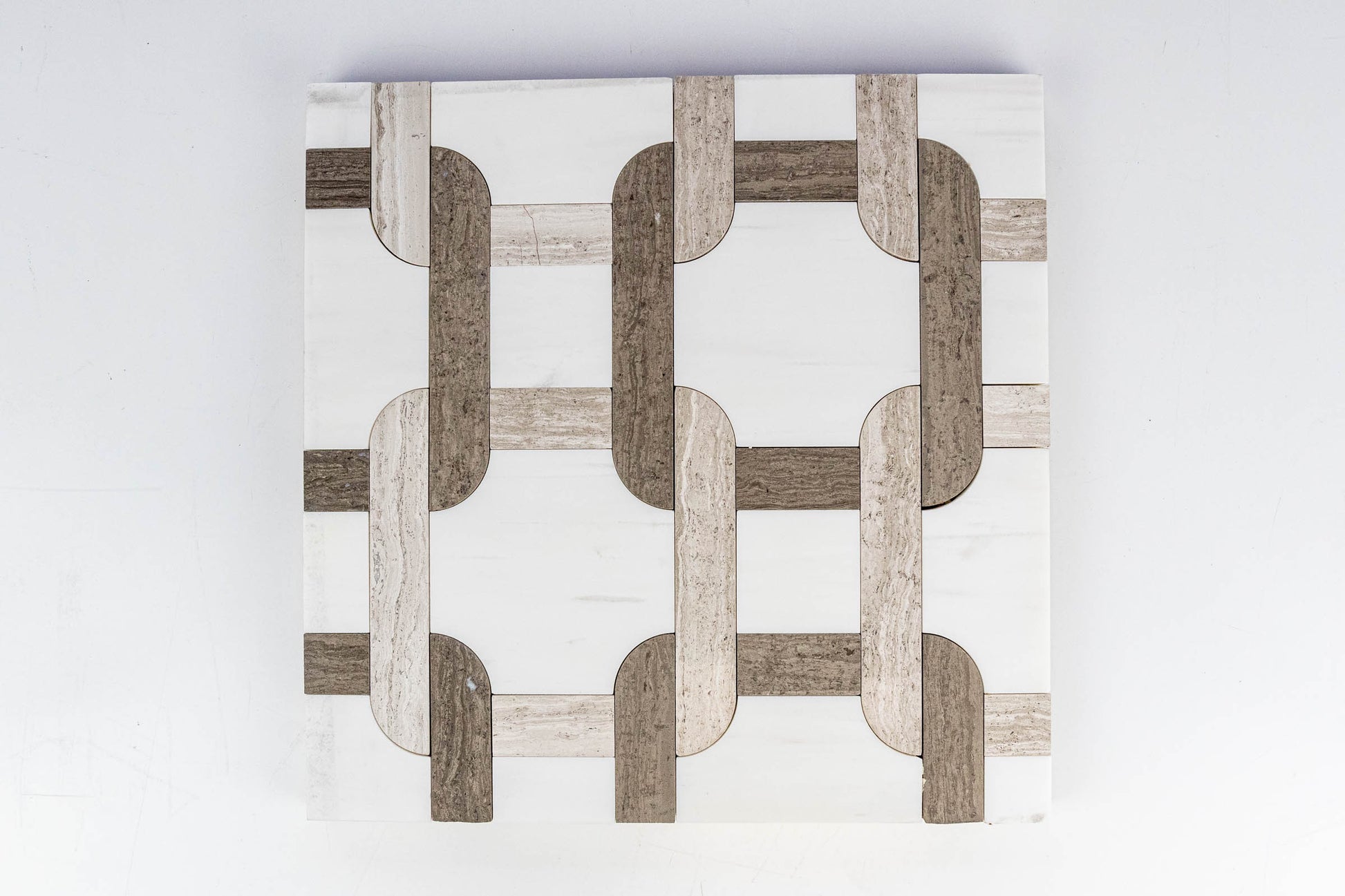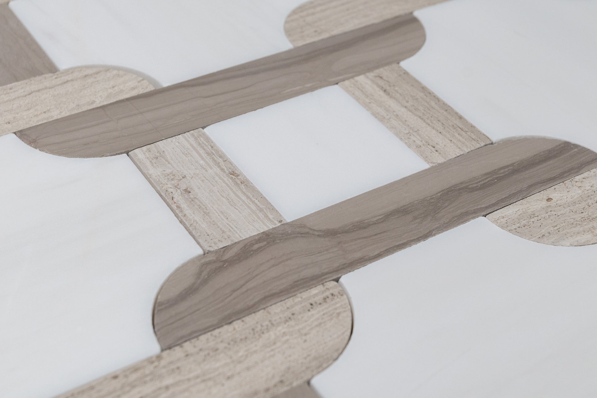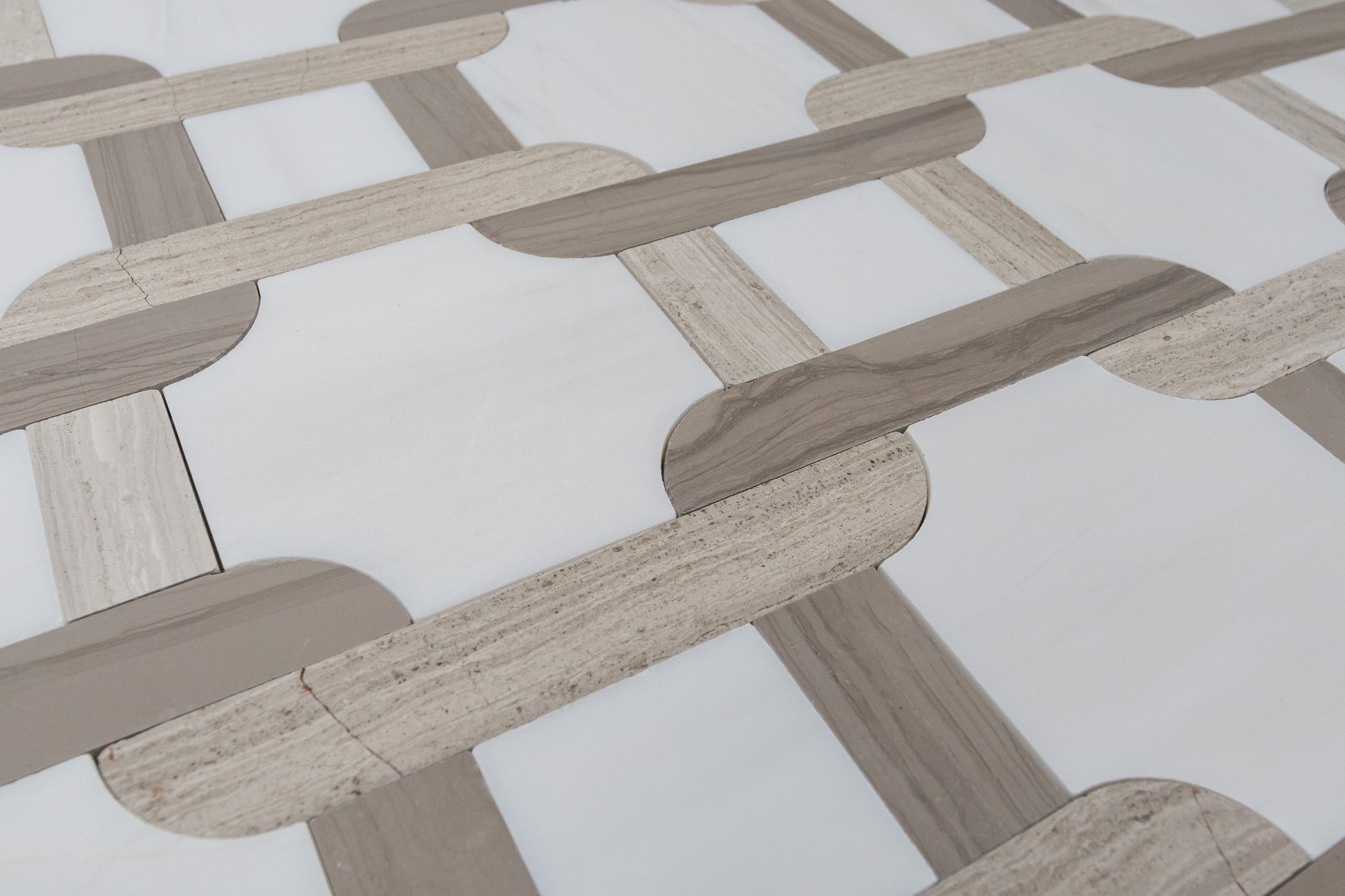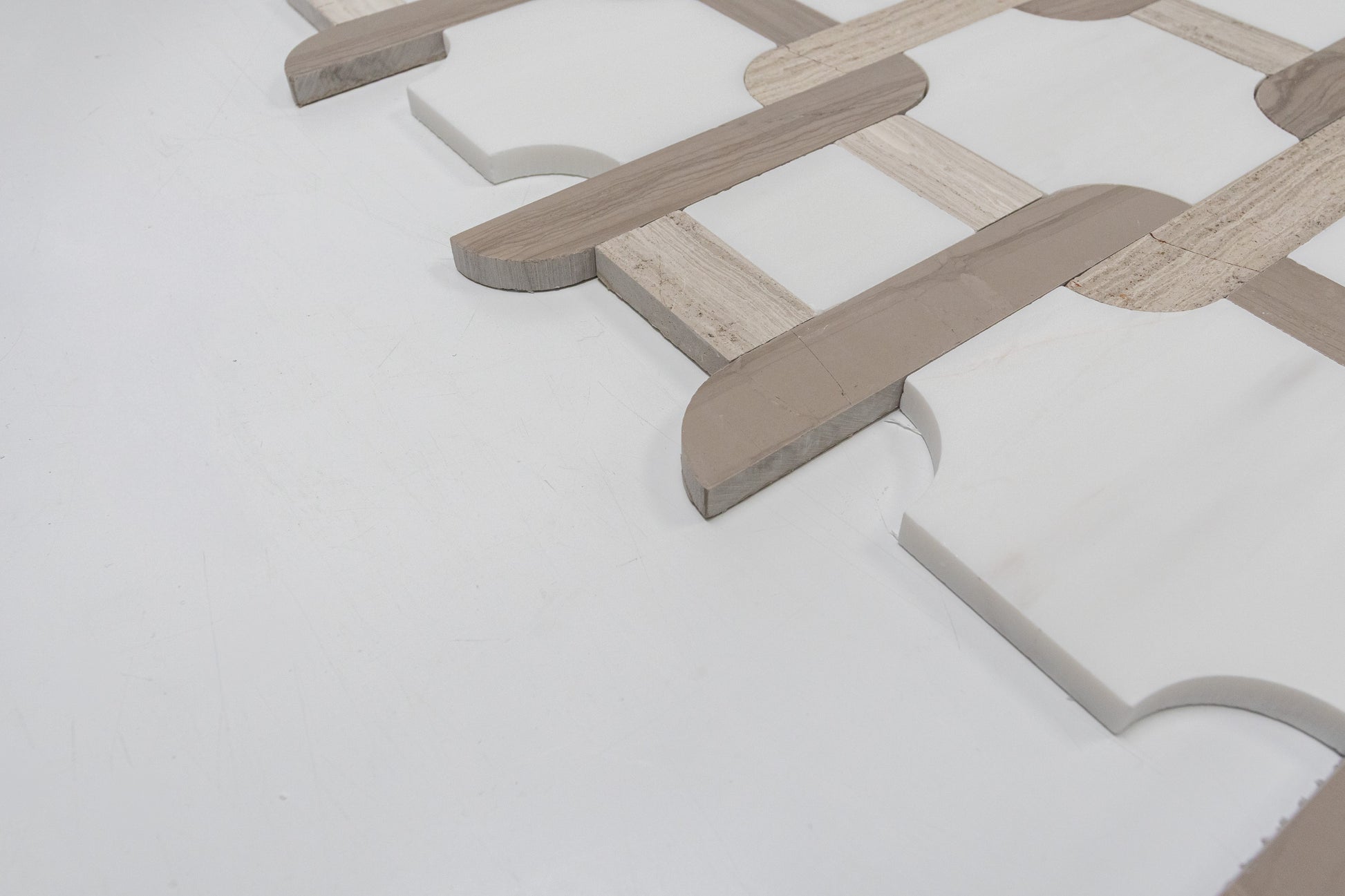 Deauville is unlike any other mosaic there is. Our inspiration came from a small commune in Northern France where their architecture is a combination of timber and natural stones. The Deauville Mosaic consists of Dolomite, White Creek Marble, and English Oak Marble; our interpretation of wood meets stone. This mosaic is perfect for pairing with to other porcelains as well with certain field porcelain tiles. *Please note* Natural stones are products of our Earth, therefore, variations in color, texture, and veining will occur. This is the beauty of a natural product and is not a defect.