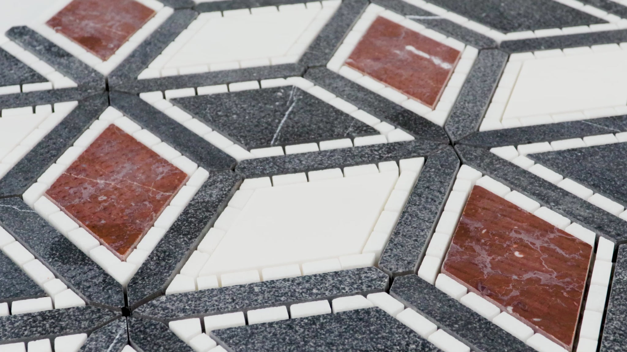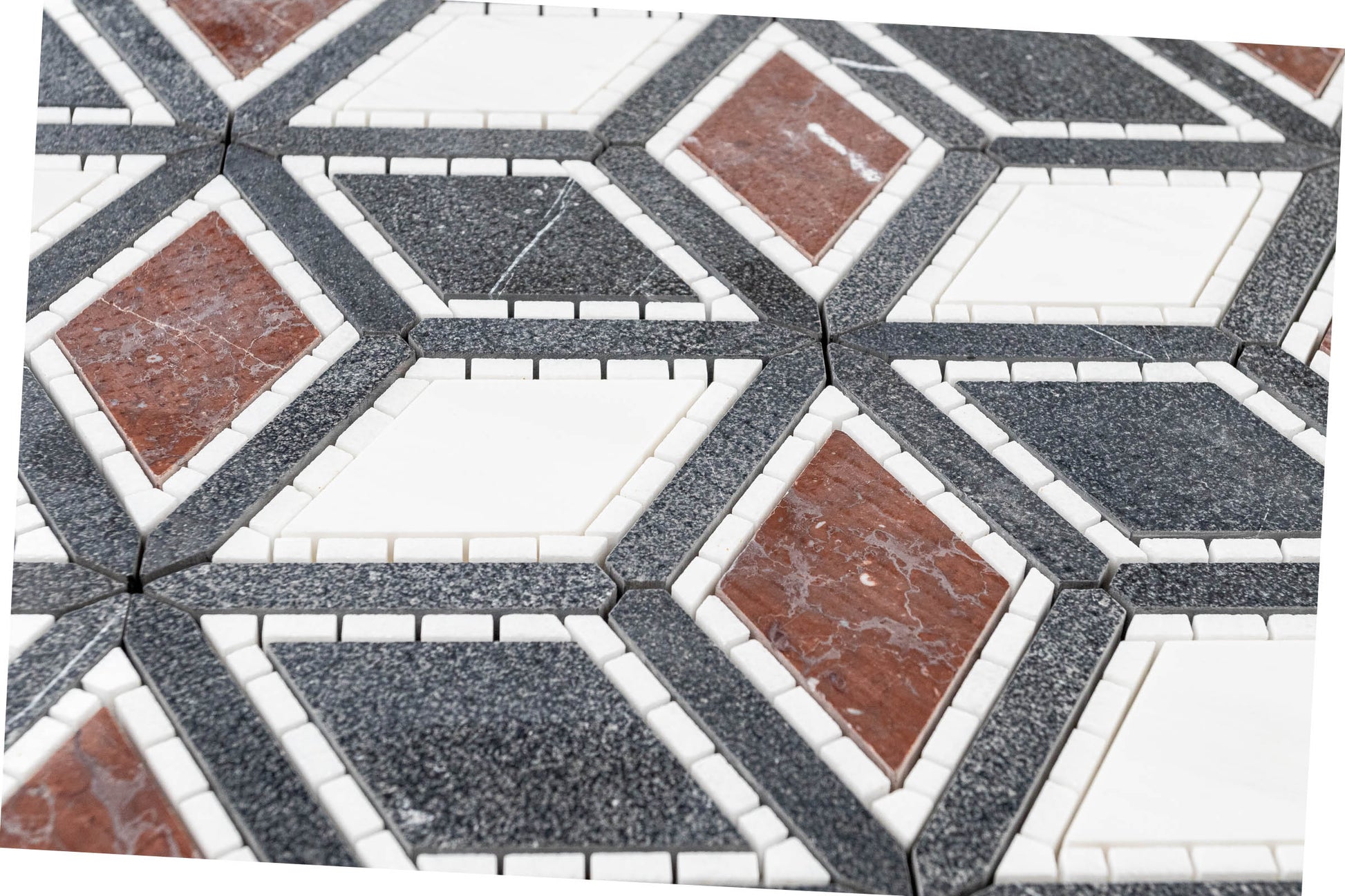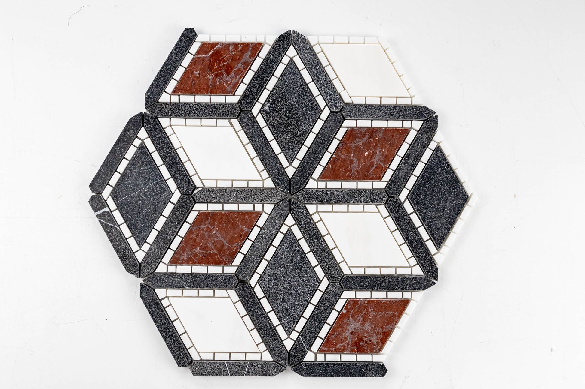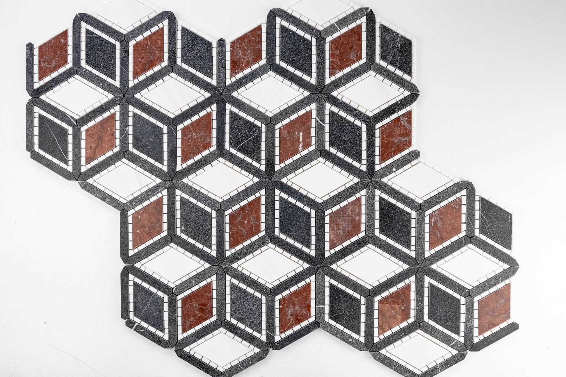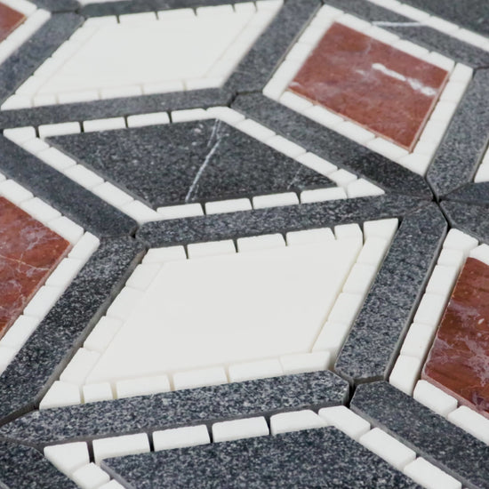 The cube mosaic has been redesigned! Julien takes what you new about a 3D cube and adds elegance and class to a modern pattern. Featured in two different color ways, the design options are endless. Our Dark Blend, composed of Dolomite, Rojo Elegante, Thassos and Nero Marquina, will transform the room with great depth and sultry. Not only is the color pallet of dark blend rich but it is rich in texture! The Nero Marquina in Julien is sandblasted for an overall look and feel of true magnificence. **Please note** Natural stones are products of our earth, therefore, variations in color, texture, and veining will occur. This is the beauty of a natural product and is not a defect.