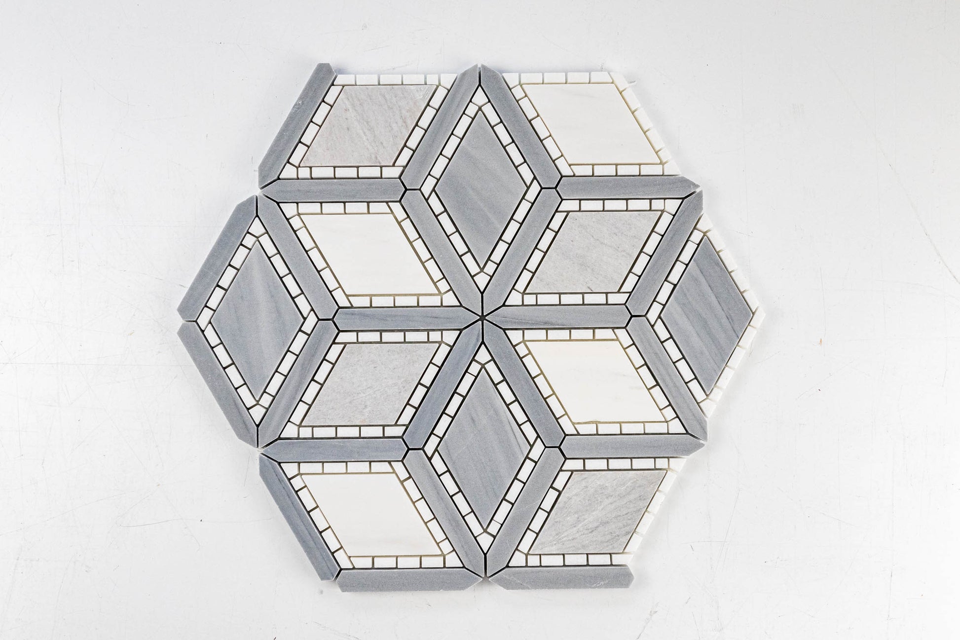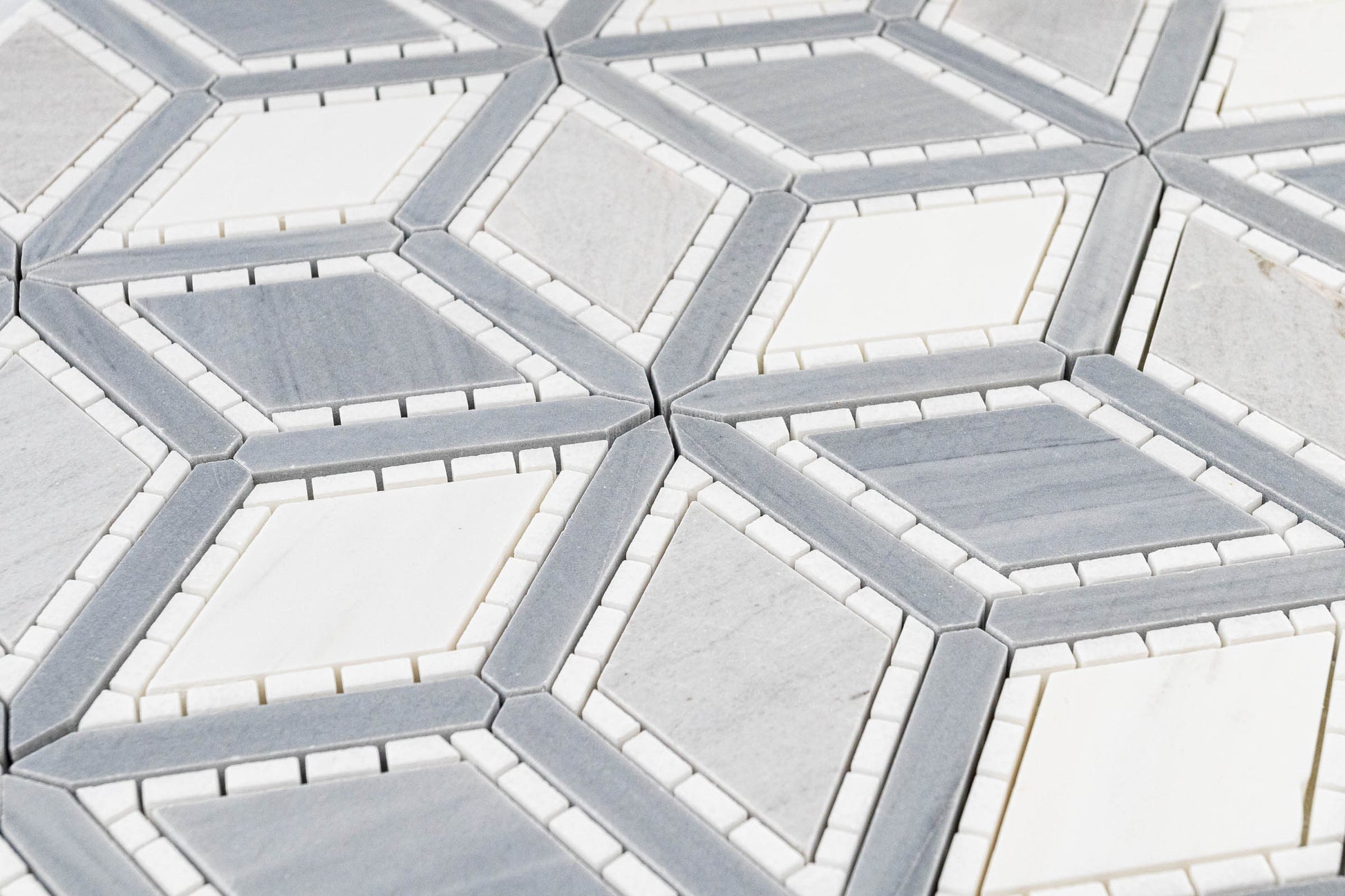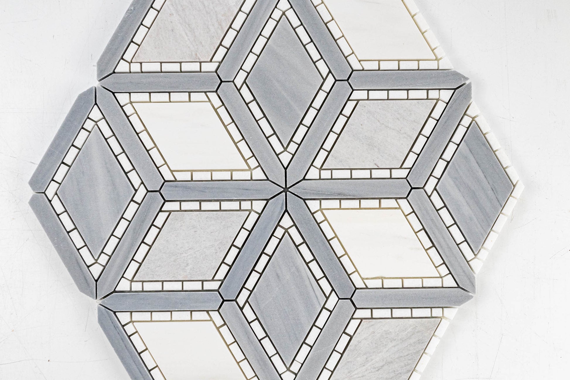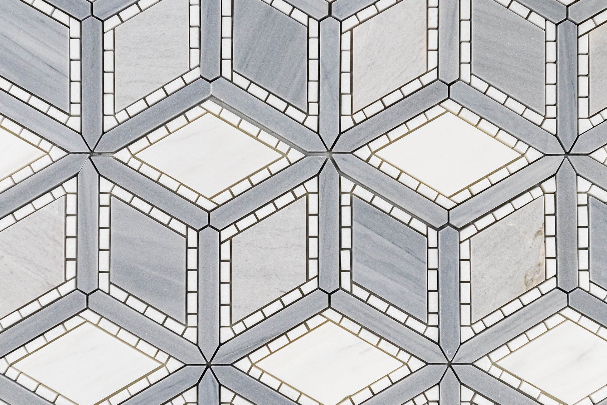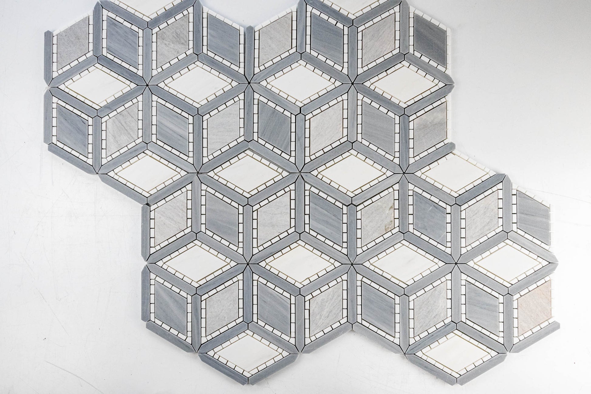 The cube mosaic has been redesigned! Julien takes what you new about a 3D cube and adds elegance and class to a modern pattern. Featured in two different color ways, the design options are endless. Our soft grey blend, composed of Dolomite, Royal Grey, Shadow Grey, and Thassos, will give you just the right amount of color in a mosaic without being overwhelming. This color way was designed to be extremely versatile and subtle to be able to match into any design or match with any other components in the room you choose. **Please note** Natural stones are products of our earth, therefore, variations in color, texture, and veining will occur. This is the beauty of a natural product and is not a defect.