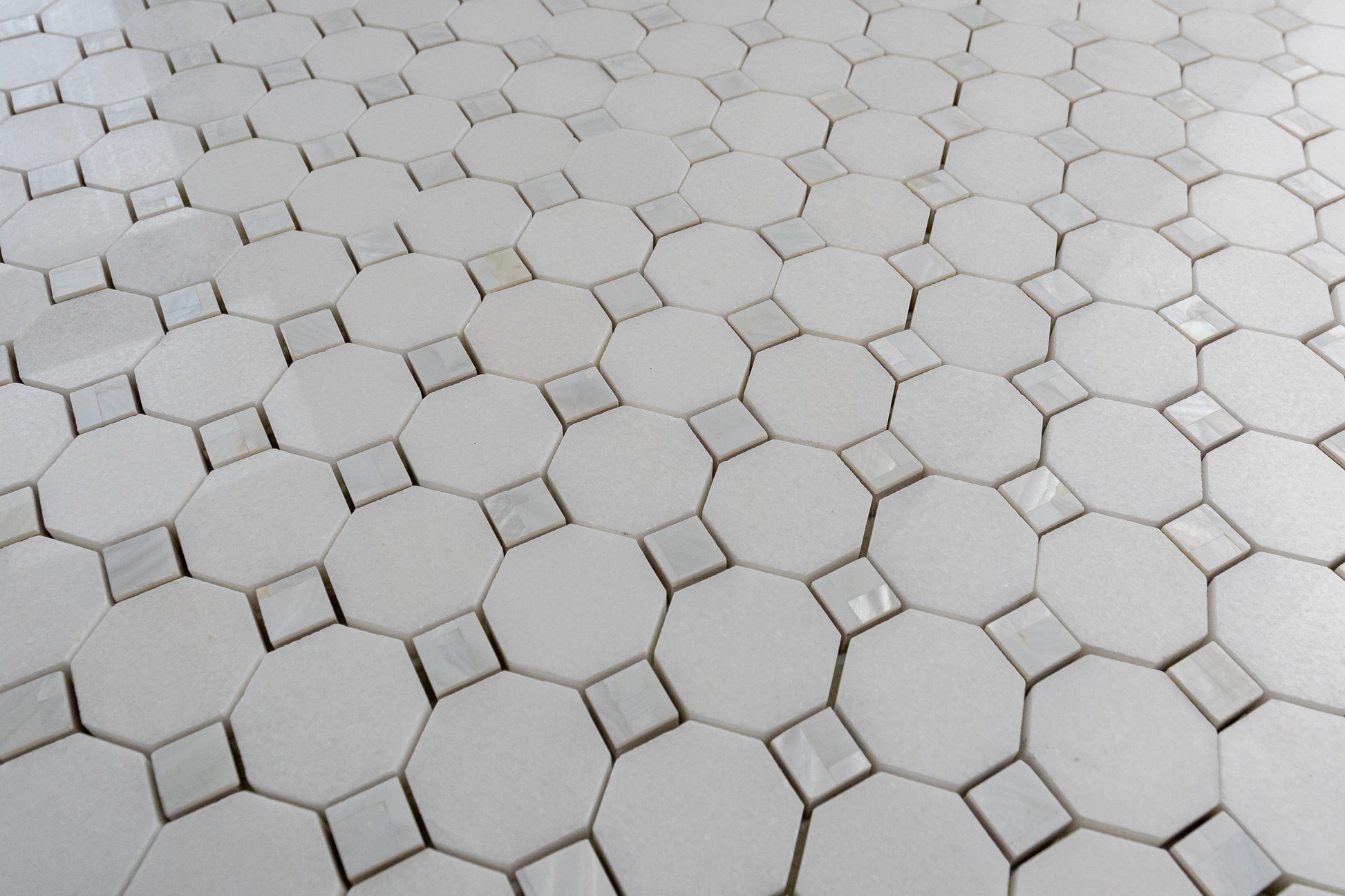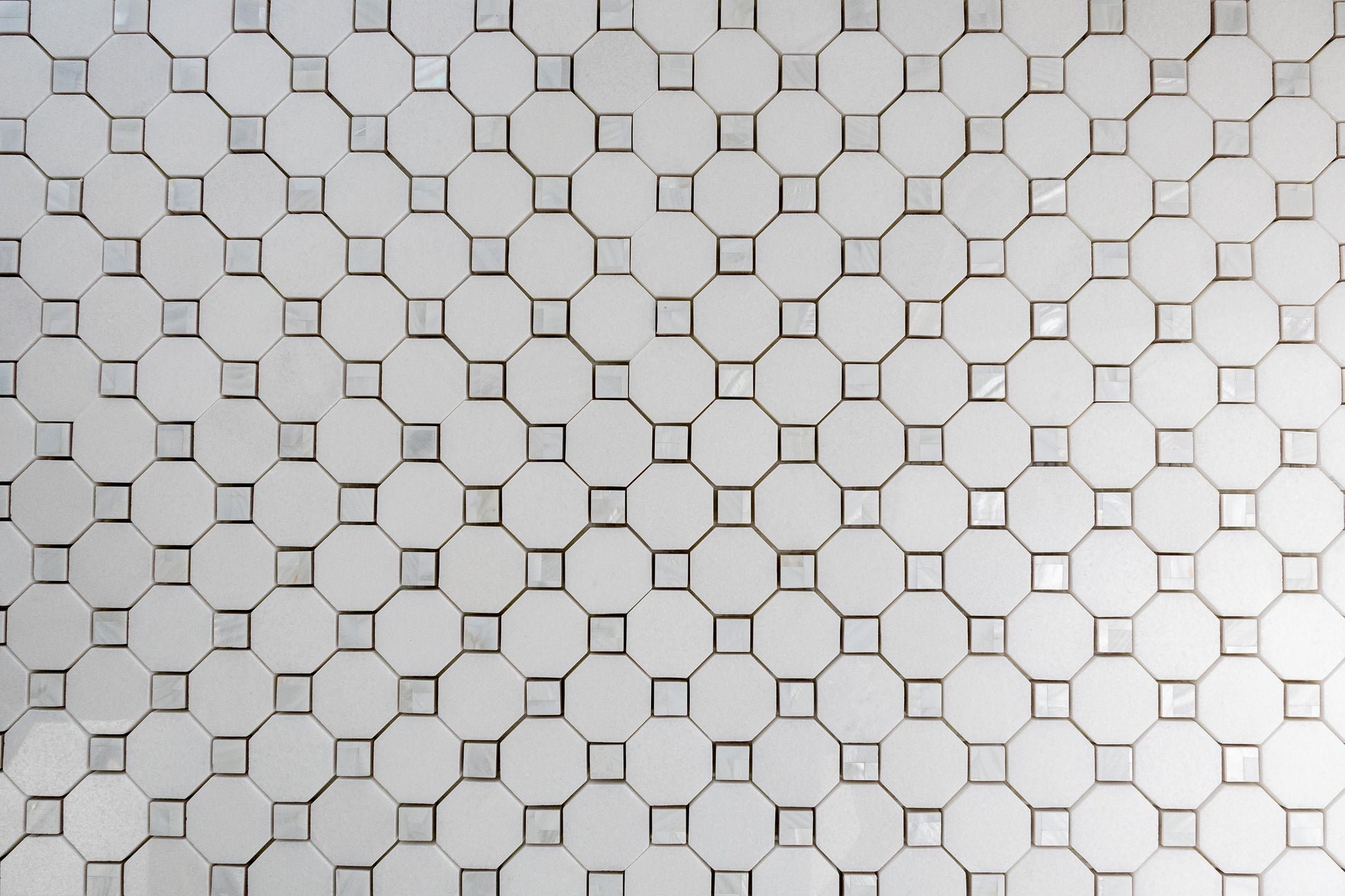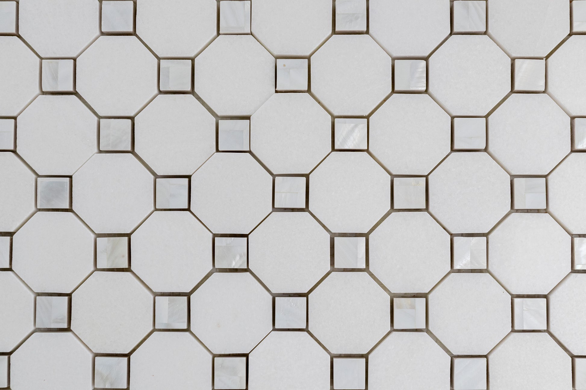Mother of Pearl and Thassos is the show stopper in any tile collection. Mother of Pearl sparkles and shines bright next to the pure snow white effect of the Thassos, leaving the room its installed in to become an alluring space fit for a Queen. Mosaics with Mother of Pearl are not recommended to install in places where it will be submerged in water, such as a shower floor or pool, as submersion will cause the metal to darken over time.