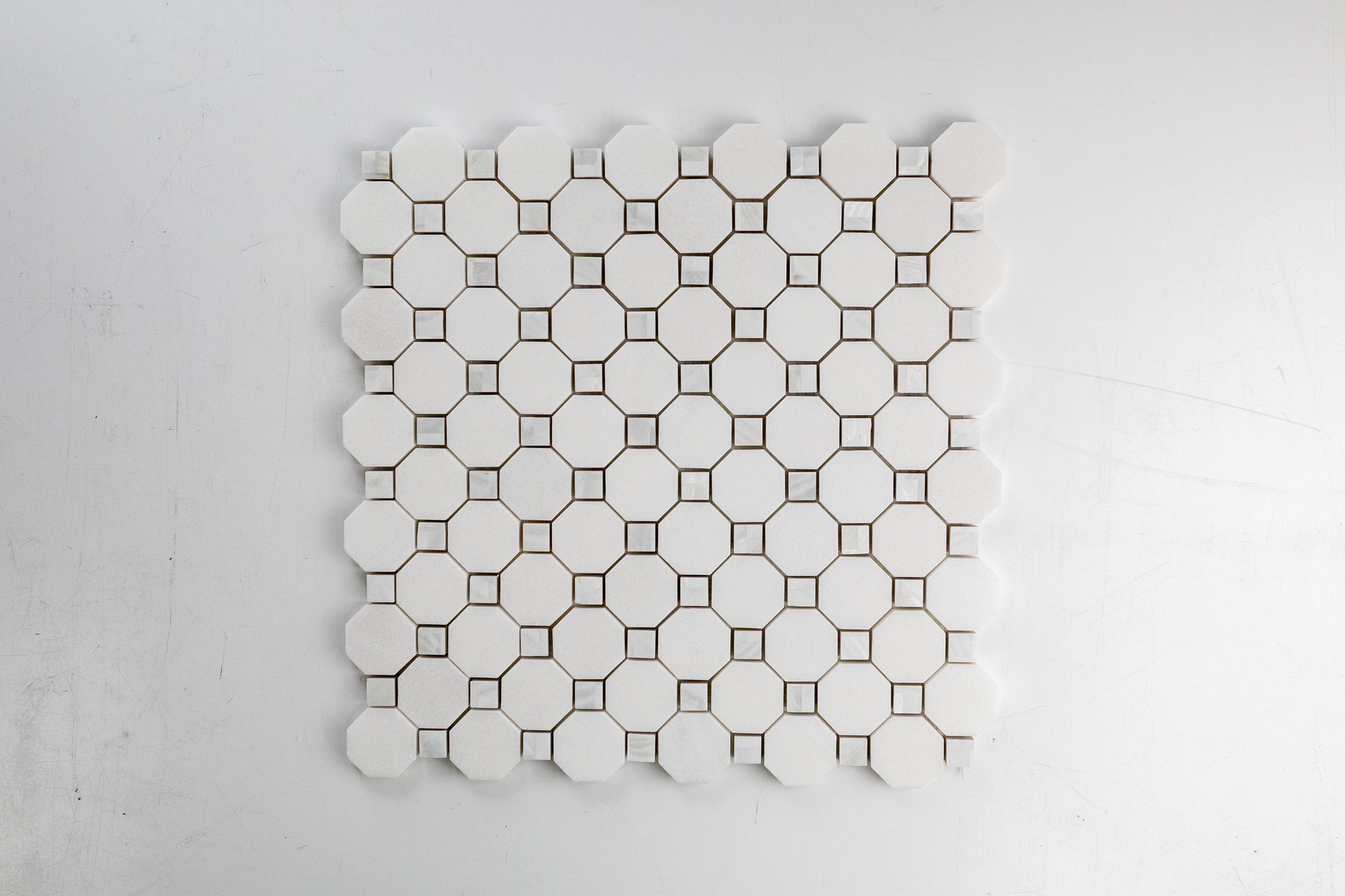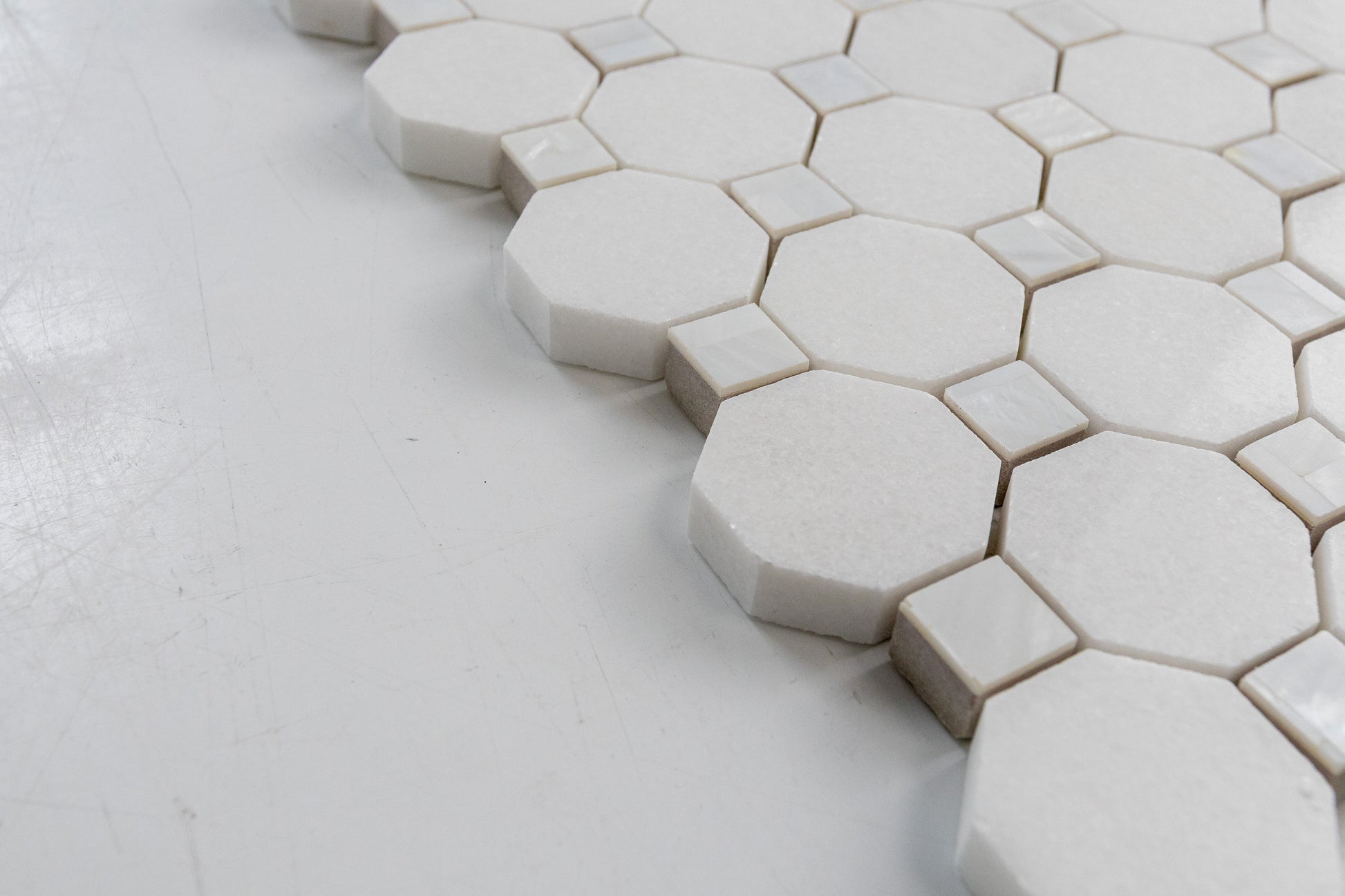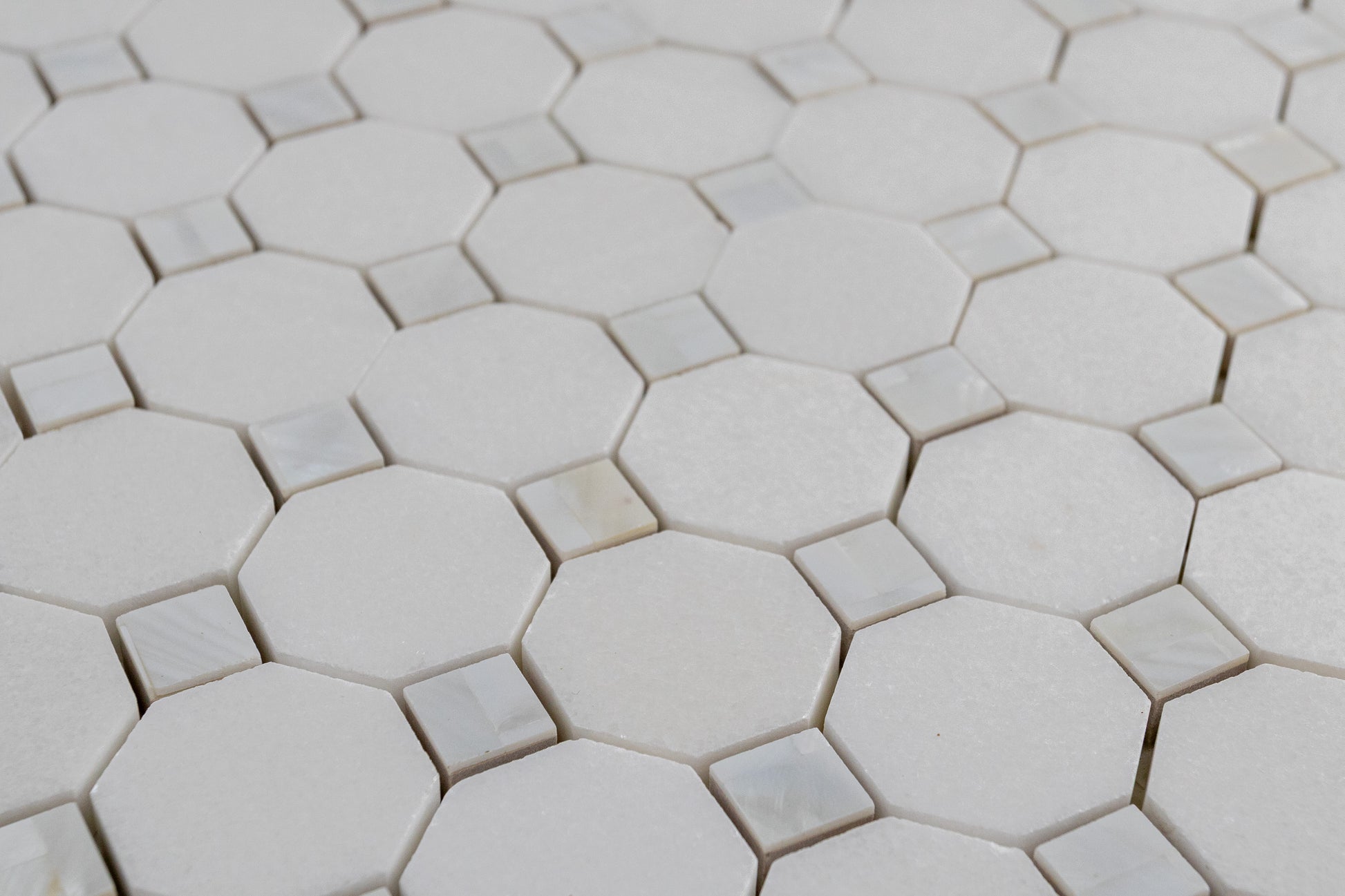 Mother of Pearl and Thassos is the show stopper in any tile collection. Mother of Pearl sparkles and shines bright next to the pure snow white effect of the Thassos, leaving the room its installed in to become an alluring space fit for a Queen. Mosaics with Mother of Pearl are not recommended to install in places where it will be submerged in water, such as a shower floor or pool, as submersion will cause the metal to darken over time.