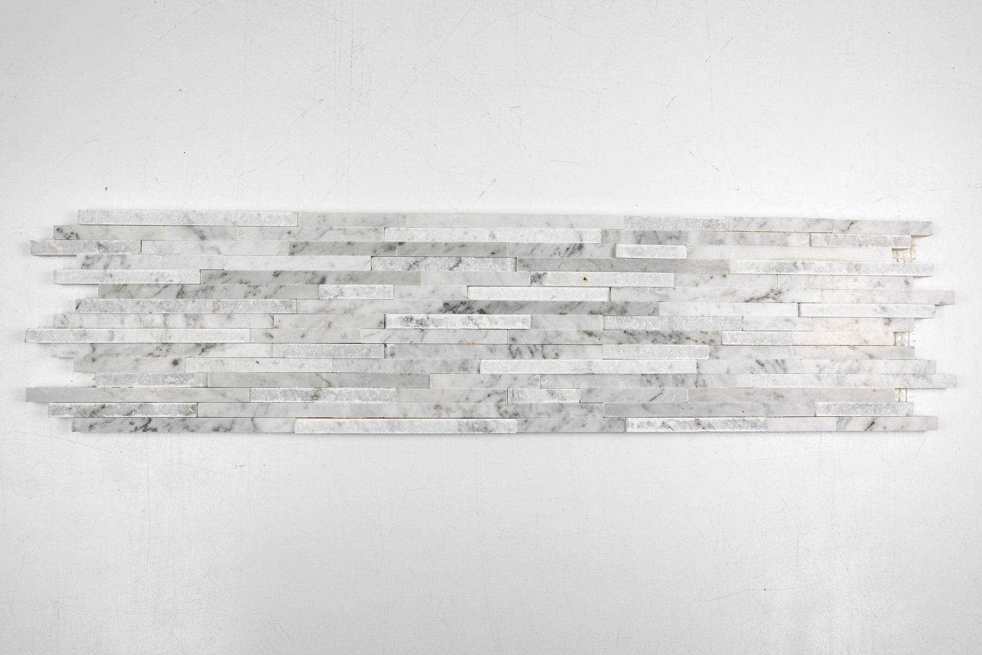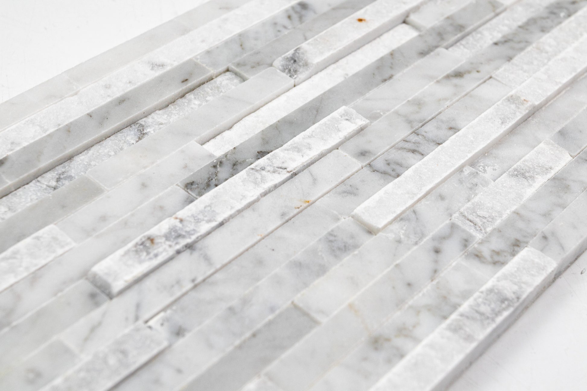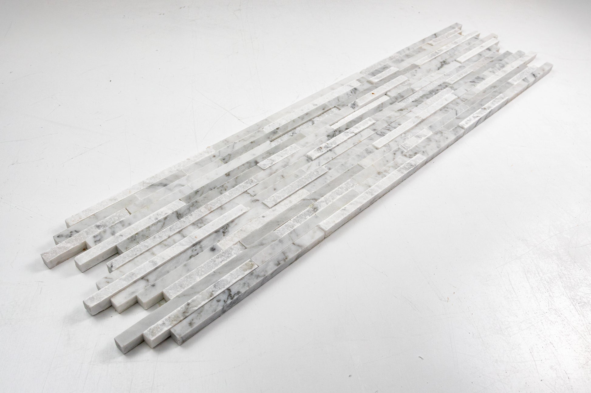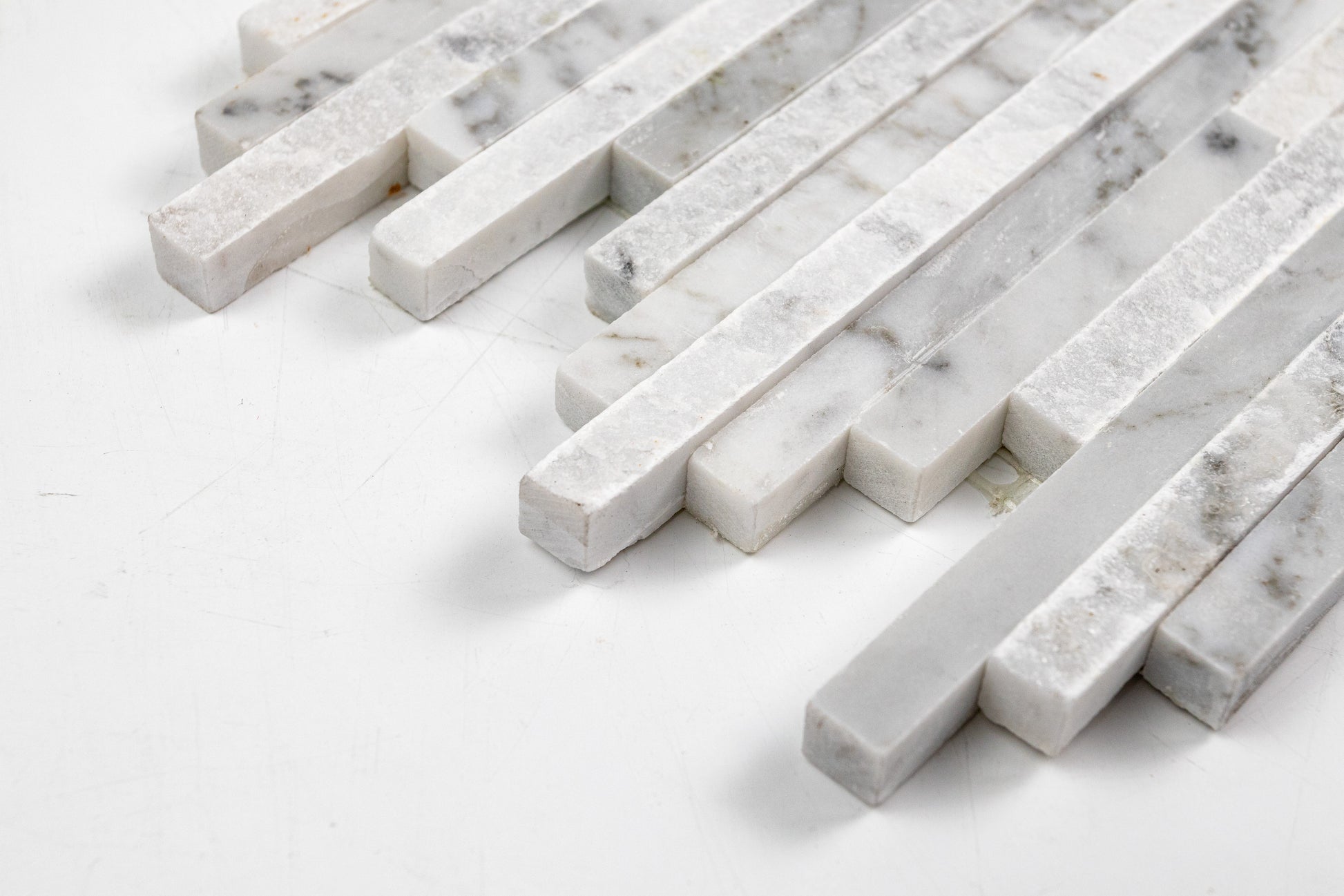 Our Splitface in Carrara marble is a texture stone mosaic crafted from natural Carrara marble. Linear marble pieces are split and layered to create a dimensional surface that emphasizes depth, shadow, and the inherent character of the stones.