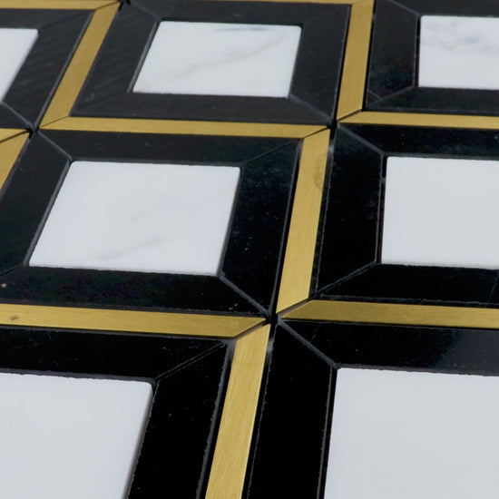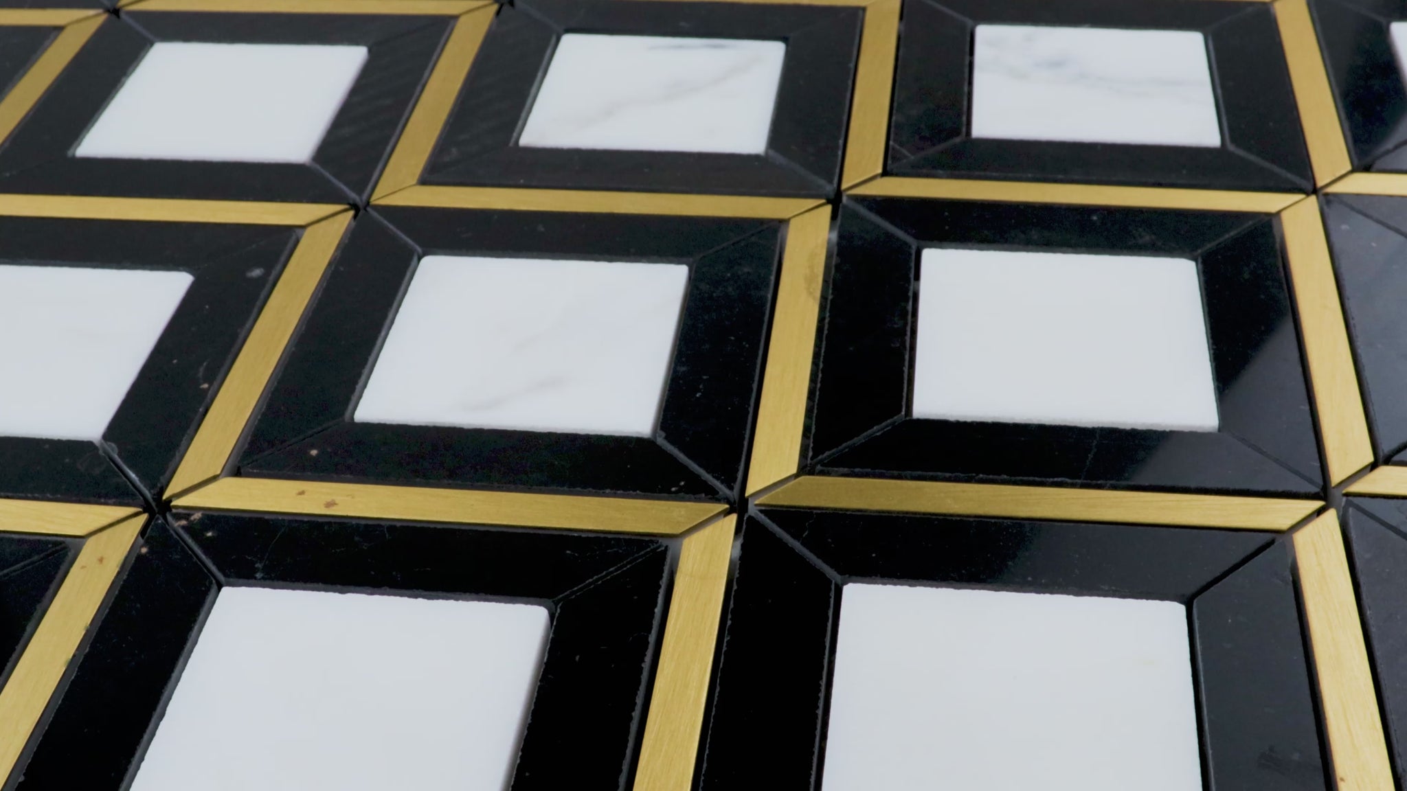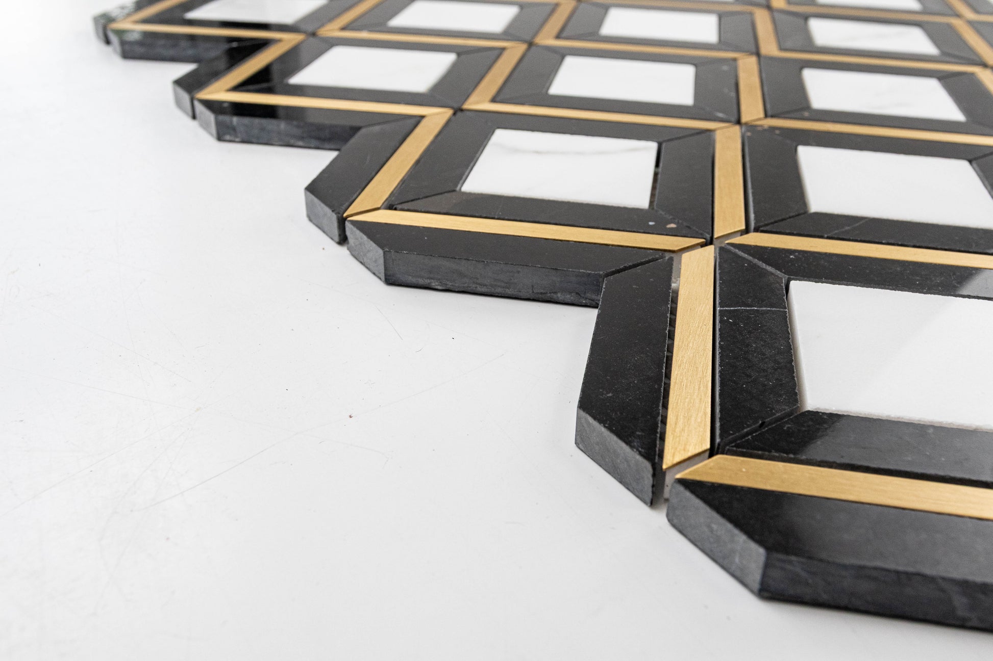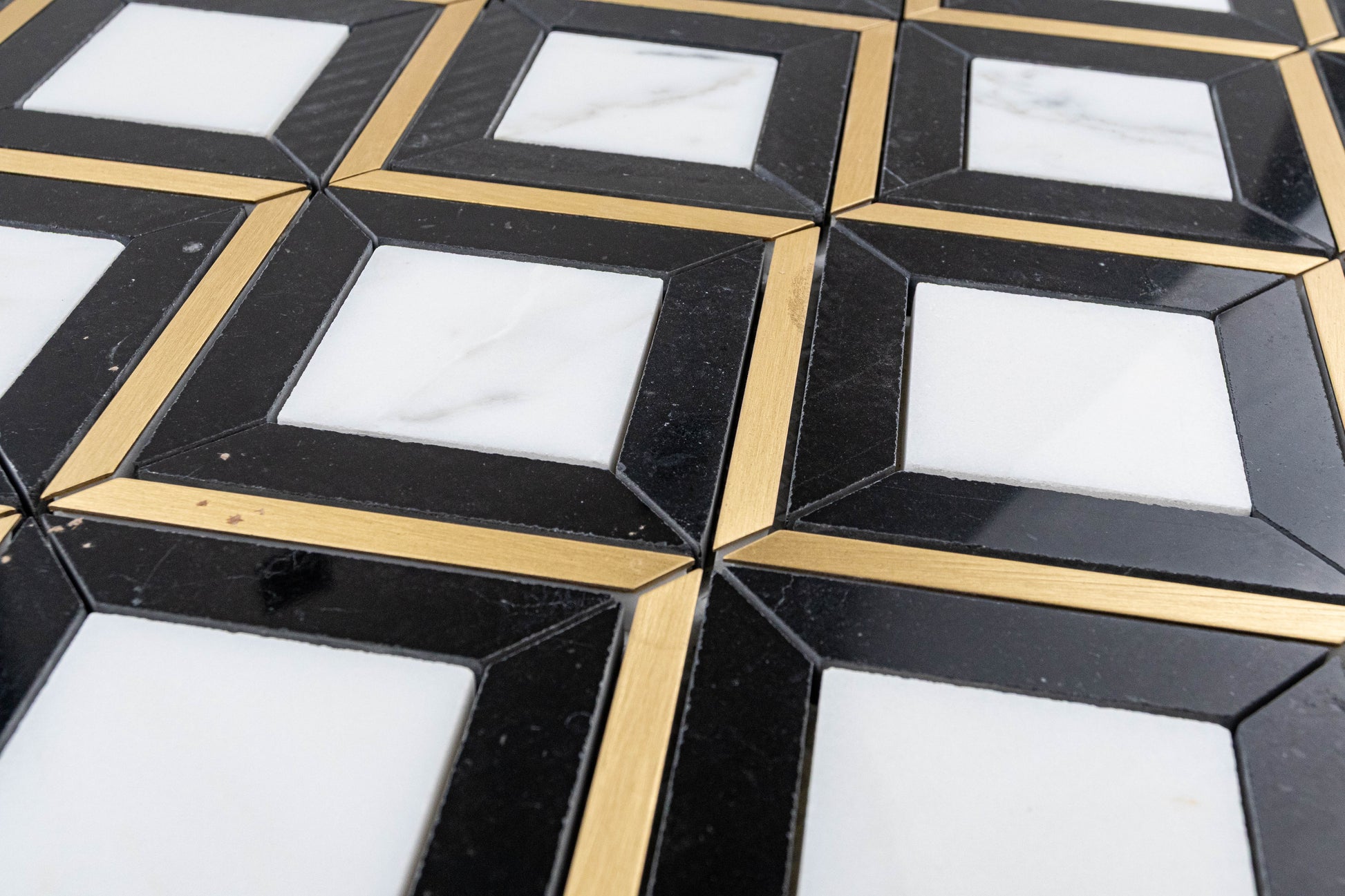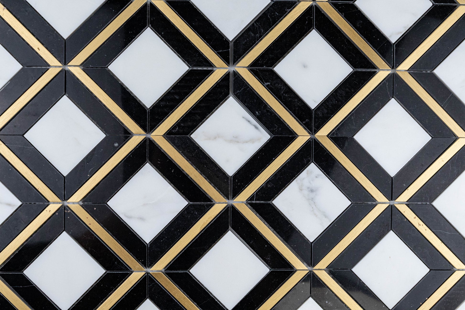 Versailles is a bold geometric mosaic that balances contrast, structure, and refinement. Calacatta marble anchors the design with a clean, luminous presence, framed by deep Nero Marquina for dramatic definition. Precision cut brass inlays introduce a subtle metallic accent, adding warmth and depth without overpowering the composition.